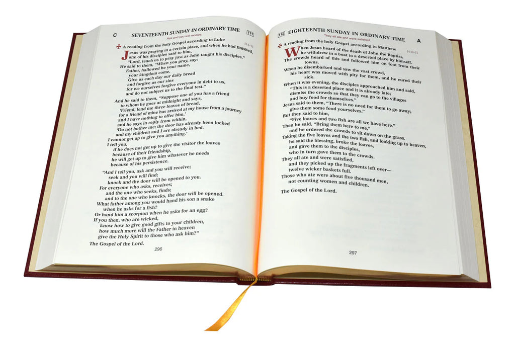 The Book of the Gospels from Catholic Book Publishing contains the new edition of the Gospel Readings approved by the U.S. Conference of Catholic Bishops for the new Lectionary for Mass. Includes Proper of Seasons (Sunday Gospels), Solemnities and Feasts of the Lord and Saints, and 17 Ritual Masses. This edition of The Book of the Gospels is printed in two colors in extra-large type in practical sense-line format. With gold-edged pages and durable red, gold-stamped cloth cover, The Book of the Gospels from Catholic Book Publishing is a magnificent book to enable the proclamation during the Liturgy of the Word.
