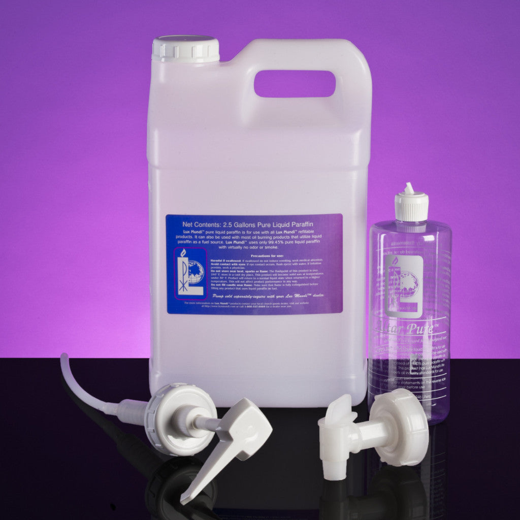 Description:  Altar Pure liquid paraffin is the purest paraffin available.  Virtually smoke and residue free, enjoy the clean benefits of this paraffin.  This product can be used with all Lux Mundi, Kerry Candle and C.M. Almy paraffin burning candles.  Approximate burn time per 2.5 gallon jug is 2500 hours.