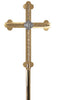 13" x 18" cross with budded ends, filigree on face and oxidized silver "IHS". Solid brass cross, two-tone brass finish.