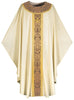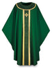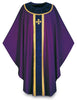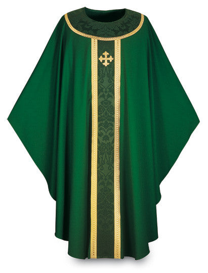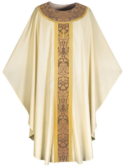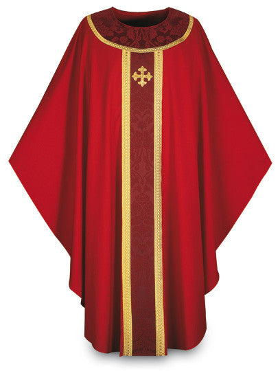 Brugia, fabric of 100% wool. Chasuble width 59", length 53"; with inside stole. Banding and decoration around neck in Goya, damask fabric, with gold braid and hand embroidered cross.