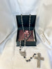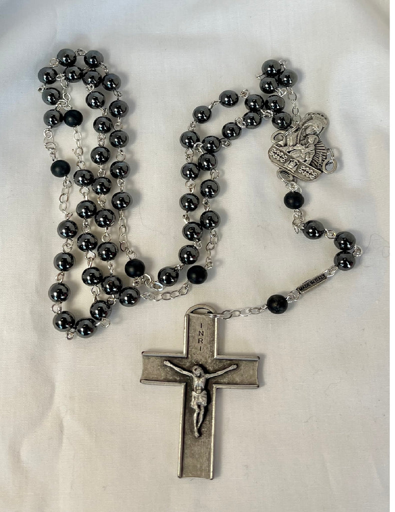 Material: Hematite Hail Mary beads and black wood Our Father beads with an antique silver Crucifix and Rosary center.