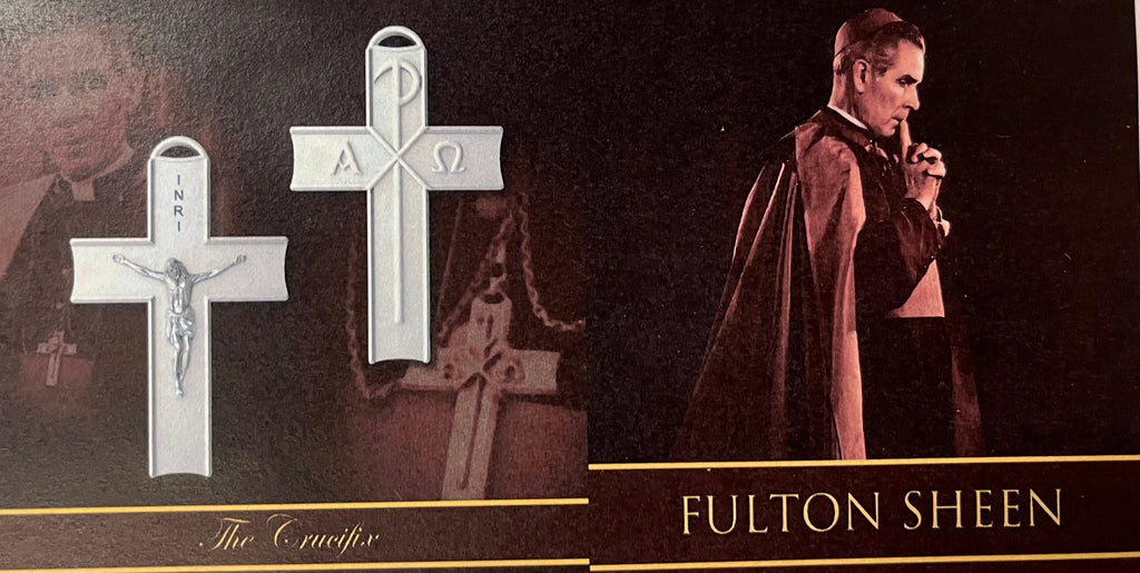 This beautiful rosary is centered around Venerable Archbishop Fulton J. Sheen. The center of the rosary has a praying Archbishop Sheen with his signature on one side and Our Lady of Perpetual Help on the other. The rosary comes in a gift box with a pamphlet that has pictures of the rosary's center and its Crucifix as well as a prayer for the Canonization of Archbishop Sheen.