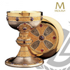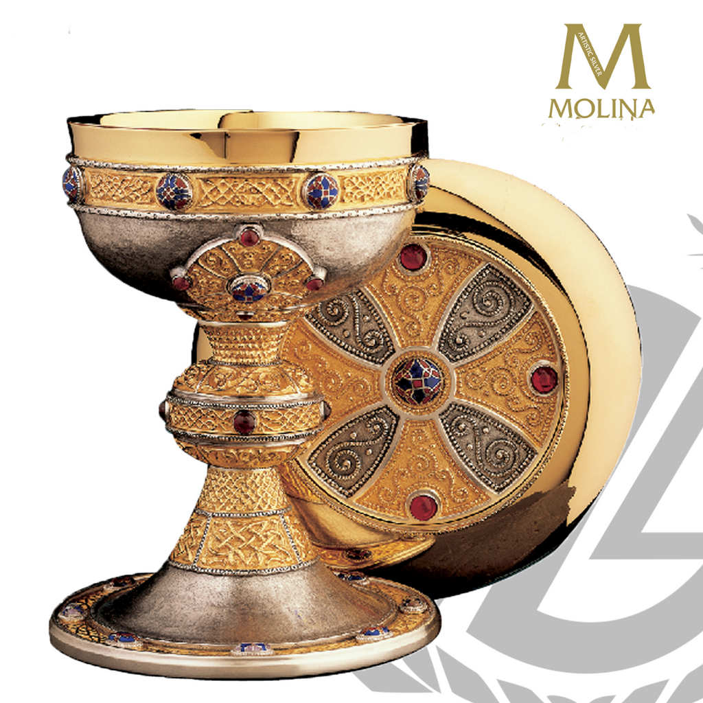 Description: "The Ardagh," a version of the original Celtic chalice. 24k gold plated contrasting on antique Silver Plate. Adorned with fire enamel cabouchons and garnet stones.