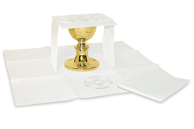 Washable sacramental mass linens make a memorable gift that formalize and celebrate the Mass Offering.  This blended linen fabric is very absorbent and easy to launder.  Decorated with a Canterbury style cross woven directly into the fabric.  Complete gift box set includes; Purificator, Lavabo Towel, Chalice Pall and Corporal.  Items also available for purchase individually.