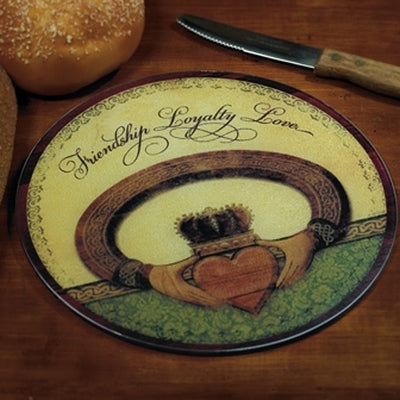 Description:  Perfect to use or display, this cutting board is crafted of tempered class and is heat safe up to 248 degrees, Hand wash.  11 3/4" diameter.