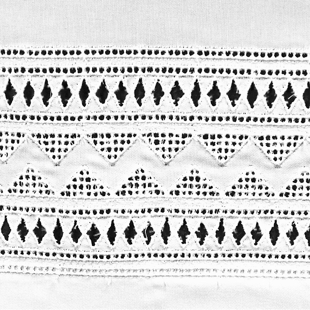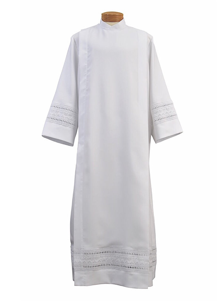 Washable embroidered eyelet front wrap alb, lace applied directly to the fabric for strength and durability. Button or Velcro closure at neck. Easy care polyester fabric.
