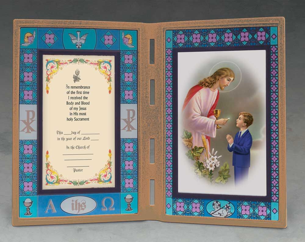 Stained glass-look, two-sided First Communion frame with color prayer card that is able to be personalized.