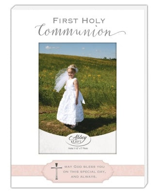 Vertical frames feature a blessing for First Communion with a silver cross attached. Holds a 3 1/2" x 5" photo. ready to hang or stand with easel back. Overall size is 6" x 8".