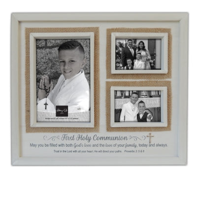 This frame has burlap and metal cross accent and is a perfect gift and keepsake for First Communion. Holds one 4" x 6" and two 2 1/2" x 3 1/2" photos. May hang or stand with easel back. 10 1/2" x 11 1/2".