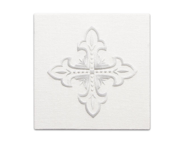 Washable sacramental mass linens make a memorable gift that formalize and celebrate the Mass Offering. This blended linen fabric is very absorbent and easy to launder. Decorated with a fleur de lis style cross woven directly into the fabric. Complete gift box set includes; Purificator, Lavabo Towel, Chalice Pall and Corporal. Items also available for purchase individually.