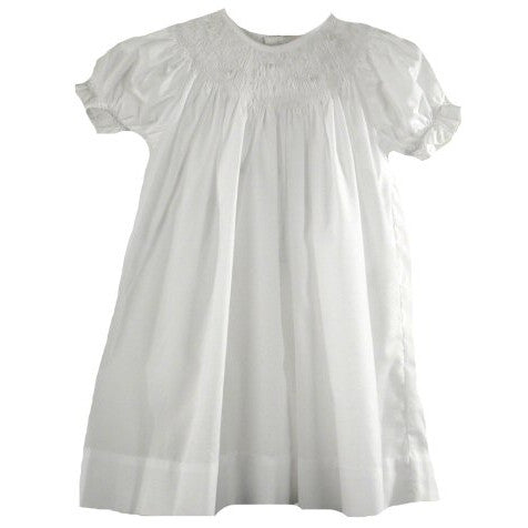 This beatiful bishop smocked daydress with matching bonnet is the perfect outfit for a baby's baptism. Available in preemie, newborn and 3,6,9 month sizes.