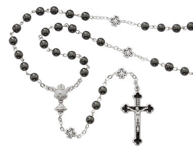 6 mm hematite beads with silver ox black enameled crucifix, silver ox chalice center, and cross shaped "Our Father" beads.. Gift box included. Made in Italy.