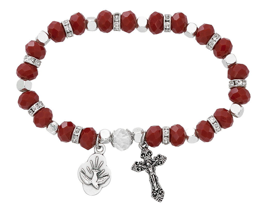 Red matt crystal beads with silver ox Holy Spirit medal and Crucifix. This beautiful bracelet makes the perfect Confirmation gift!