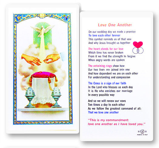 Description: Laminated Italian prayer card that features rich colors and decorative gold accents. Artwork from famous Italian line Fratelli-Bonella. Traditional prayer on the reverse side.