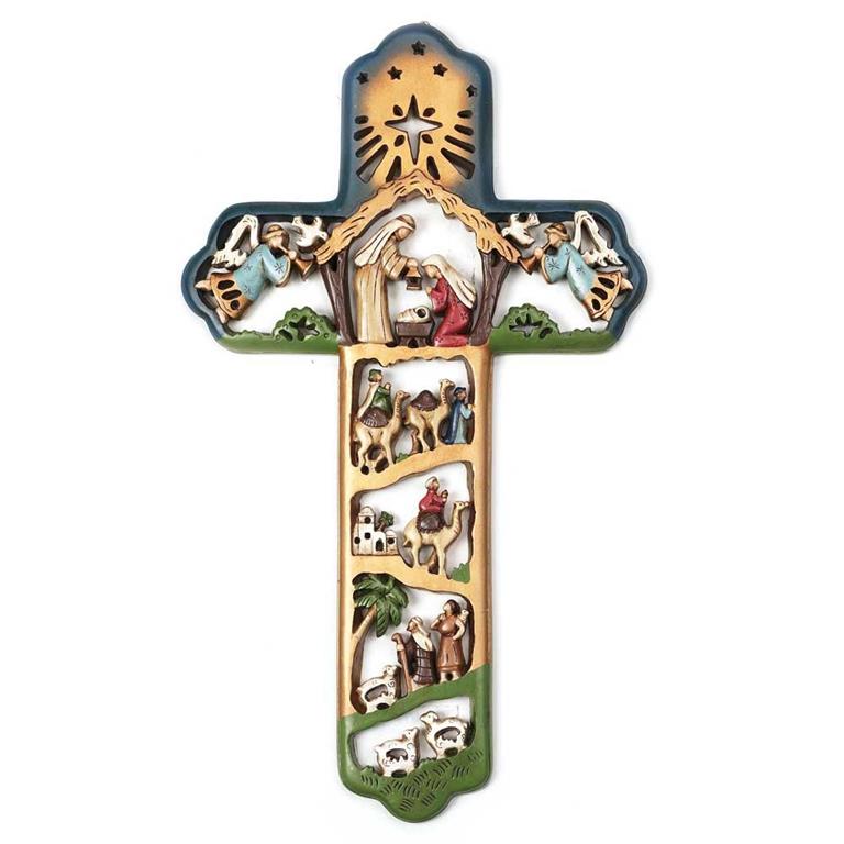 The colored Nativity wall cross features detailed cutout design that beautifully depicts the nativity story. Wonderful decoration at Christmas time - or all year long!