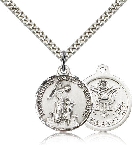 Sterling Silver Guardian Angel Army Medal with Chain Pendant