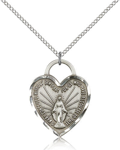 Sterling Silver Miraculous Heart Medal with Chain Pendant