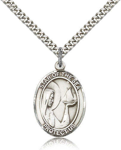 Sterling Silver Our Lady Star of the Sea Medal with Chain Pendant Large