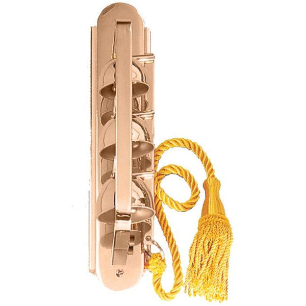 Wall mounted altar bell set with decorative bell cord.  Constructed of cast bronze or brass.  Hand polished in either a satin or high polish finish.  Oven baked finish for lasting durability.  Pictured in High Polish Bronze finish.